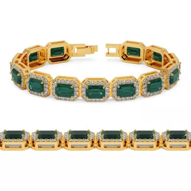 A delightful bracelet with magnificent lab grown emerald-cut or radiant-cut yellow moissanites of 0.6 ct each in a halo of small moissanites totaling 2.6 ct of white, yellow or rose gold 14k or 18k.