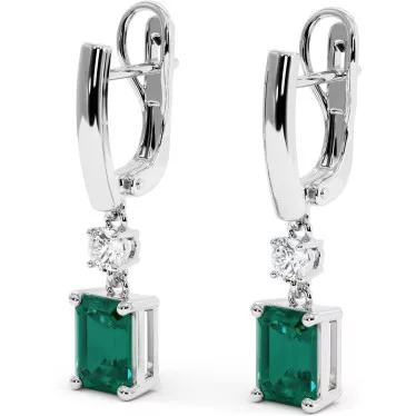 This beautiful leverback earrings features a 6.5mm round Lab-grown Emerald center stone, round brilliant moissanite side stones, set in 18 or 14k gold.