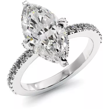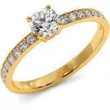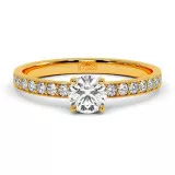 This beautiful ring features 0.35ct center round brilliant moissanite complemented by 18 sparkling moissanite side stones around the shank made of 14k or 18k gold.