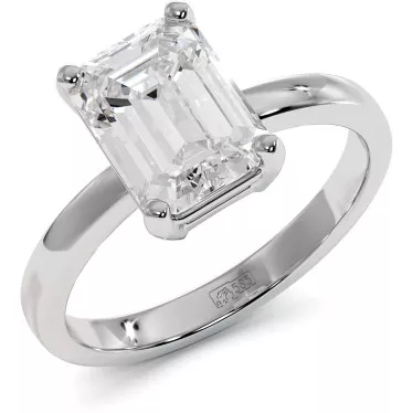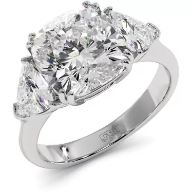 This striking engagement ring features 3.2 carats center fancy intense yellow elongated cushion cut moissanite in double claws setting complemented by round brilliant moissanite stones along the shank, available in 14k or 18k white, yellow or rose gold.
