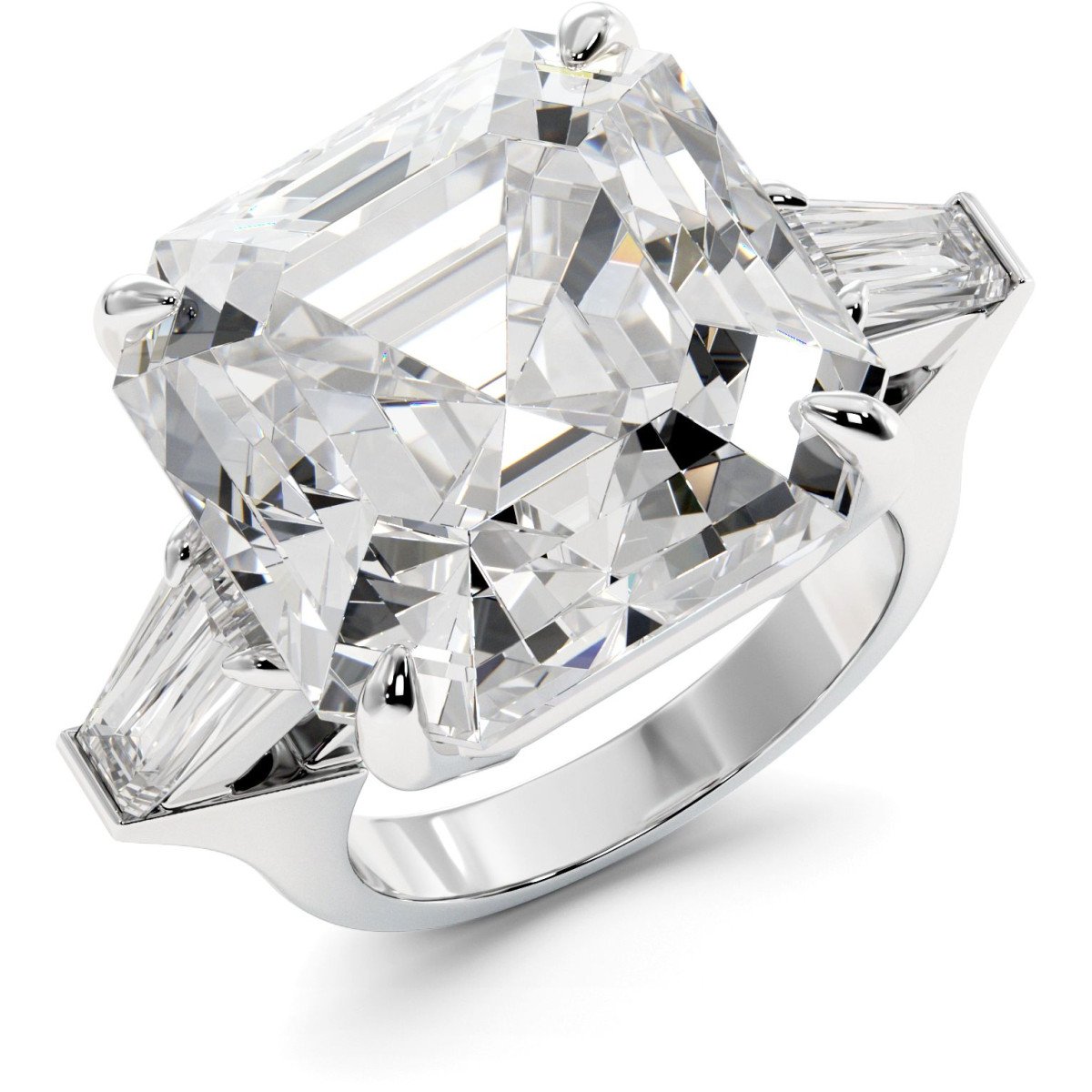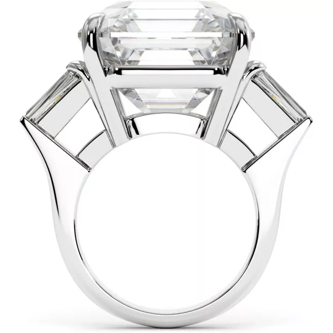 This magnificent ring is decorated with a large noble asscher-cut moissanite in the center weighing 16.9 carats and two baguette-shaped moissanites (totaliy 0.8 carats) set in white, yellow or rose gold 14K or 18K