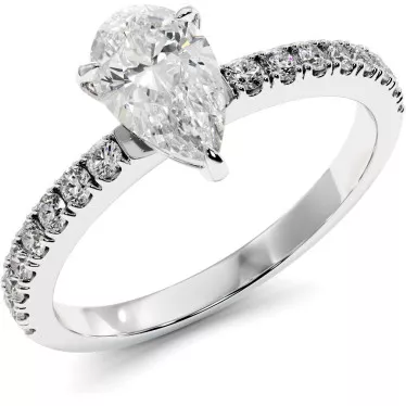 This stunning engagement ring is decorated with a 3.6 carat pear-shaped moissanite in the center and round colorless moissanites with a total weight of 0.12 carats on the sides, in your choice of white,yellow or rose14k/18k gold.