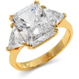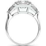This stylish engagement ring features moissanite 3.5 carat lab grown emerald cut or 3.9 radiant cut center stone accompanied by two trillion cut moissanite side stones (1.4ctw) set in white, yellow or rose 14k or 18k gold.