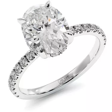 This beautiful engagement ring features large 2.8ct center moissanite complemented by sparkling moissanite side stones (1.68 ctw) along the ring shank set in white, yellow or rose 14k or 18k gold.