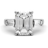 This graff promise styled engagement ring features moissanite a 6ct lab grown emerald cut or 6.5ct radiant cut center stone and two baguette moissanite side stones (0.8ctw) set in 14k or 18k white, yellow or rose gold.
