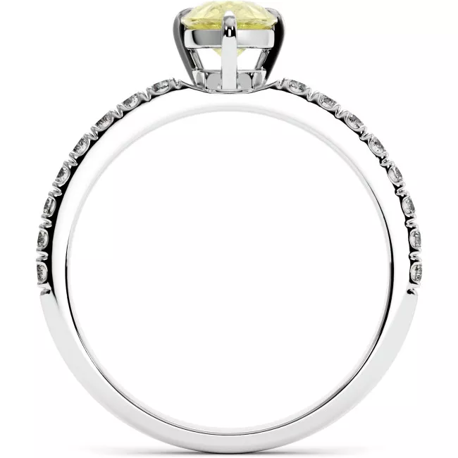 This delightful engagement ring is decorated with a 1 ct pear-cut yellow moissanite center stone and small round side stones of moissanite with a total weight of 0.16 ct, cast in white, yellow or rose gold of 14k or 18k of your choice.