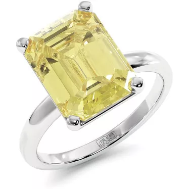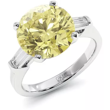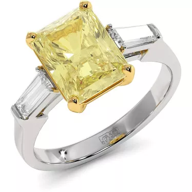 This stunning engagement ring is decorated with a 3.6 carat pear-shaped yellow moissanite in the center and round colorless moissanites with a total weight of 0.12 carats on the sides, in your choice of white,yellow or rose14k/18k gold.