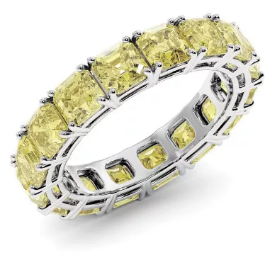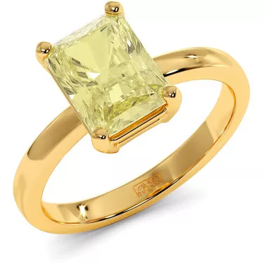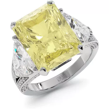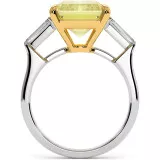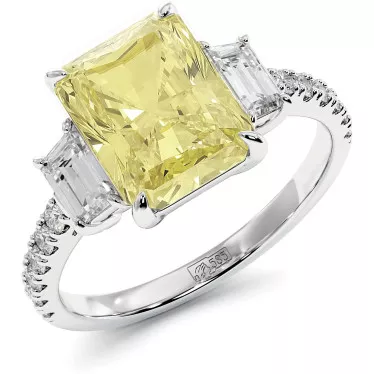 This graff promise styled gorgeous ring features large noble yellow moissanite center 8.5ct lab grown emerald cut or 9.3 ct radiant cut and two baguette cut moissanite (0.8 ctw) set in white, yellow or rose gold 14k or 18k.