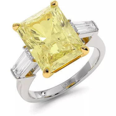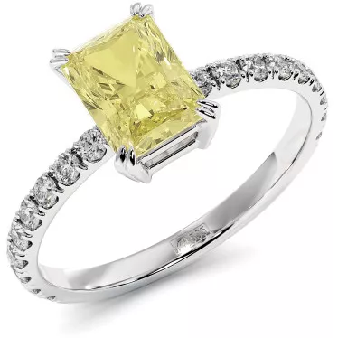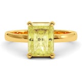 This stylish engagement ring features yellow moissanite 1 carat lab grown emerald cut or 1.2 carat radiant cut in white, yellow or rose 14k or 18k gold.