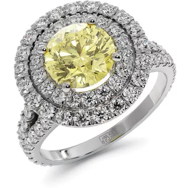 This beautiful ring features yellow moissanite 2 carat cushion cut center stone surrounded by halos of sparkling round moissanite side stones set (0.81 ct) in 14k or 18k white, yellow or rose gold.