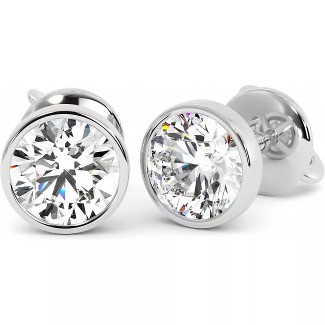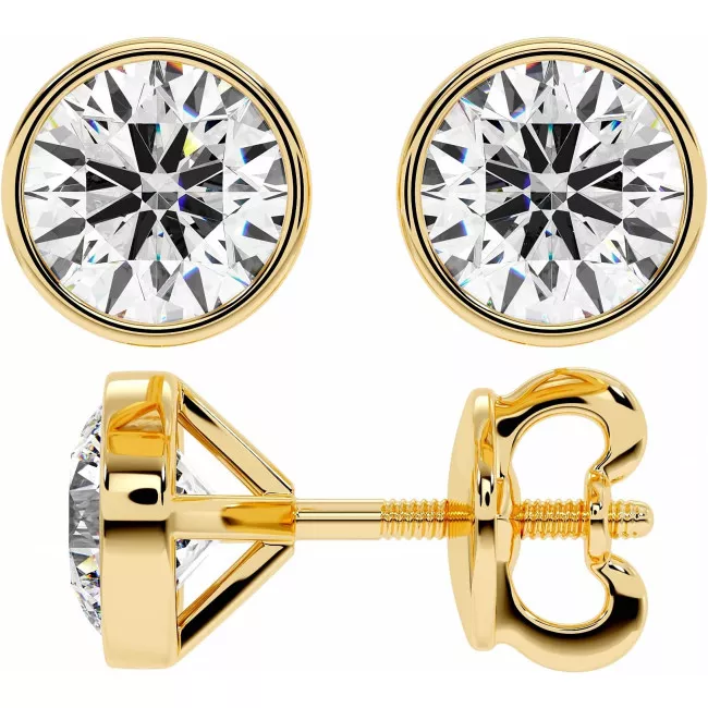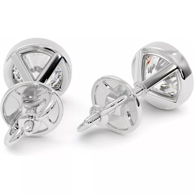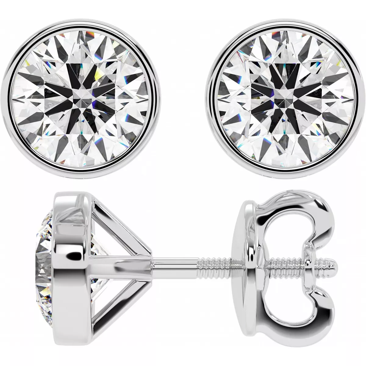 These beautiful round brilliant moissanite stud earrings (1.9ct each) are designed to rest as close to the ear as possible to prevent drooping of the earring. Available in your choice of 14k white, rose, or yellow gold.