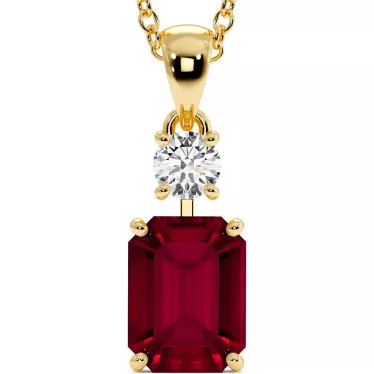 $650This stylish pendant with 3ct lab grown emerald-cut central lab grown ruby is complemented by 0.25ct round colorless moissanite made of 14K or 18K white, yellow or rose gold of your choice.