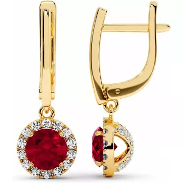 Featuring a central red cushion-cut lab grown rubies of 1.3 carats each and a moissanite halo (0.42 carats total), these stunning stud earrings are available in your choice of 14k or 18k white, yellow or rose gold.