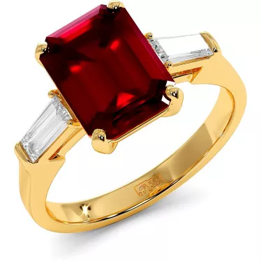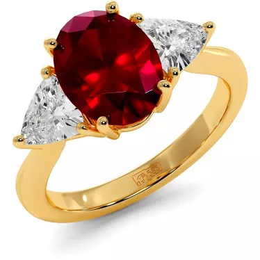 This stunning engagement ring is decorated with a 2.54 carat pear-cut lab grown ruby in the center and smaller, colorless pear-cut stones with a total weight of 0.42 carats on the sides, cast in 14/18 ct white, yellow or rose gold of your choice.