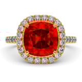 This amazing ring features 4ct cushion cut grown lab grown ruby surrounded by a halo of sparkling round moissanites (0.5 ctw) in 14k or 18k white, yellow or rose gold setting.