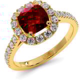 This beautiful ring features 2 carat center cushion grown lab grown ruby surrounded by a halo of sparkling round moissanite side stones (totally 0.39ctw) set in 14k or 18k white, yellow or rose gold.