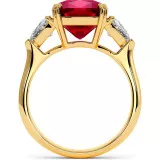 This gorgeous engagement ring features 3.96ct lab grown ruby cushion cut center and trillions moissanite (1.4 ctw) features double-claw setting in 14k or 18k white, yellow or rose gold.