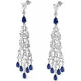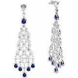 Amazing long earrings with 4 large white pear-cut moissanites of 1 carat each and 4 pear-cut lab grown sapphires of 1.2 carats each and a scattering of pear lab grown sapphires, moissanites marquise-cut and round-cut totaling 21 carats in white, yellow or rose gold 14k or 18k.