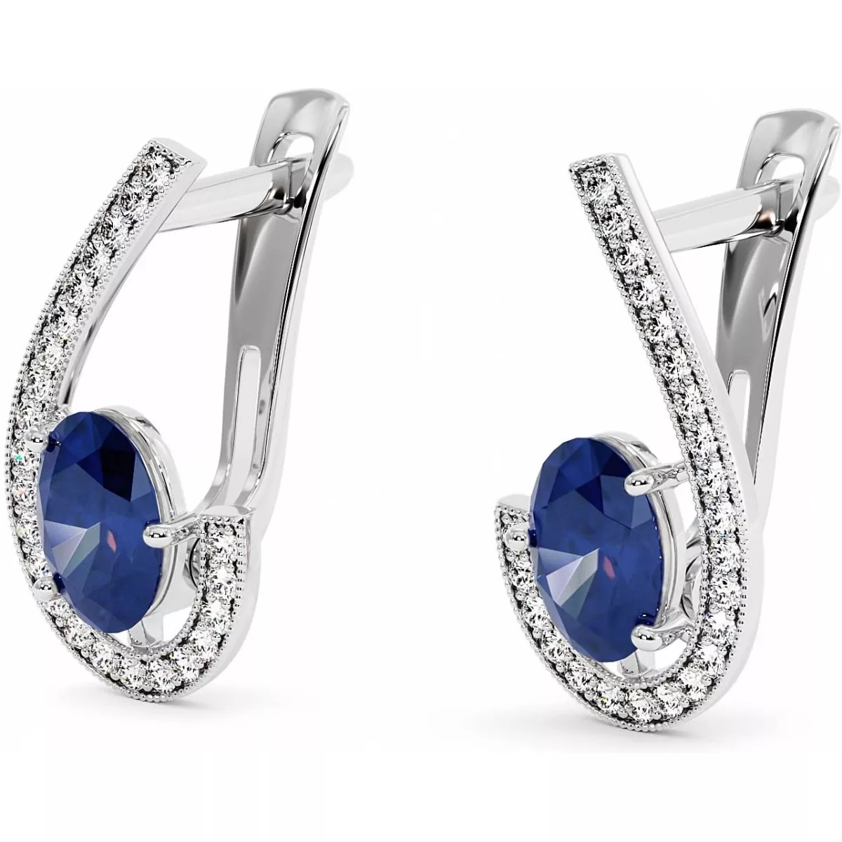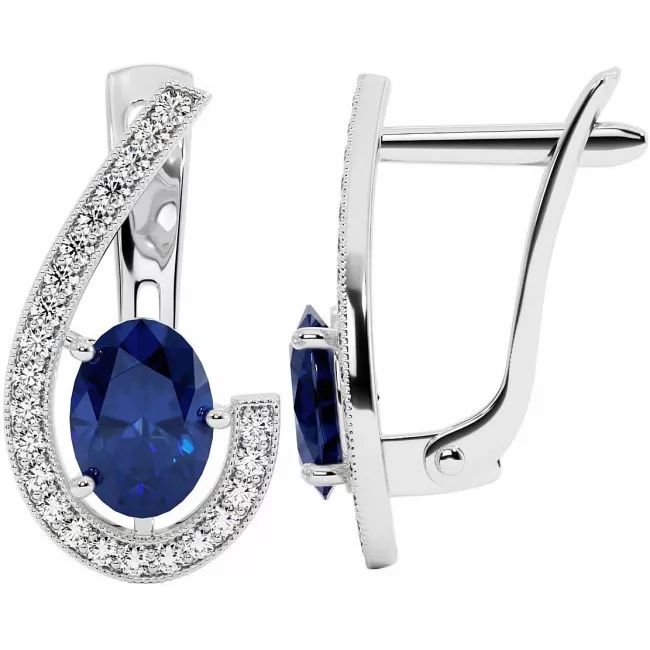 Amazing earrings with oval-cut sapphire (blue or pink) of 1.1 carats each and a track of small moissanites totaling 0.23 carats in white, yellow or rose gold of 14k or 18k.
