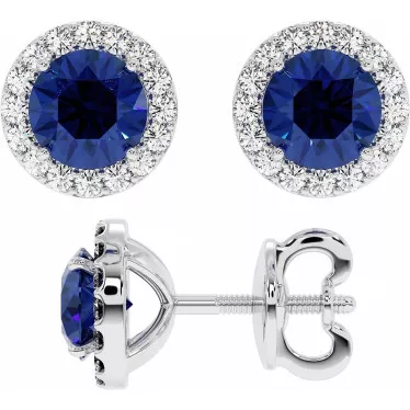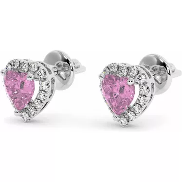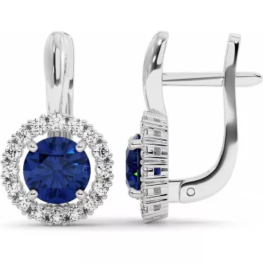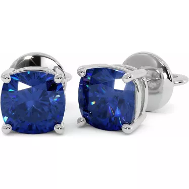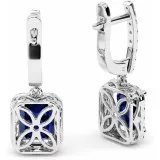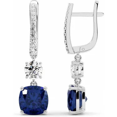 These amazing earrings feature 3 carat lab grown emerald-cut blue or pink lab grown sapphire stones, complemented by a scattering of brilliant 0.78-carat moissanites, set in 14k or18k white, yellow or rose gold.
