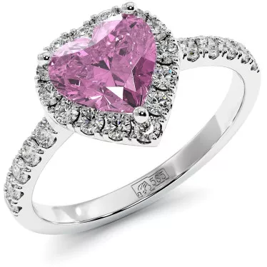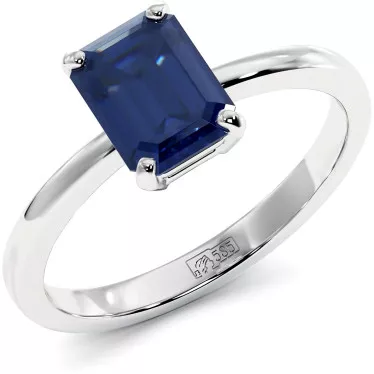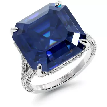 This beautiful ring features blue or pink lab grown sapphire 7.2 carat lab grown emerald cut center stone surrounded by halos of sparkling round moissanite side stones set (0.59 ct) in 14k or 18k white, yellow or rose gold.
