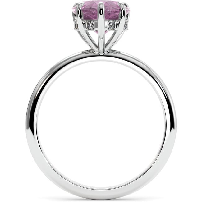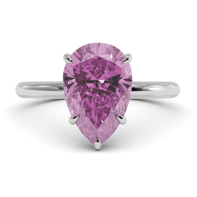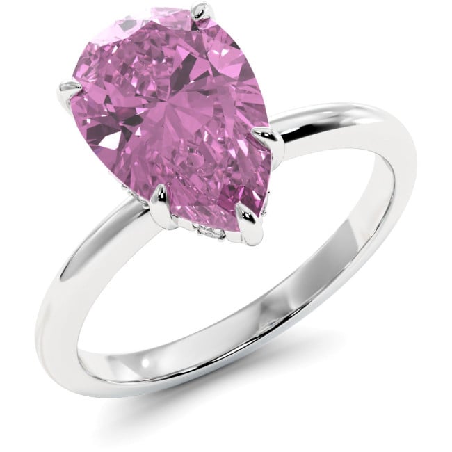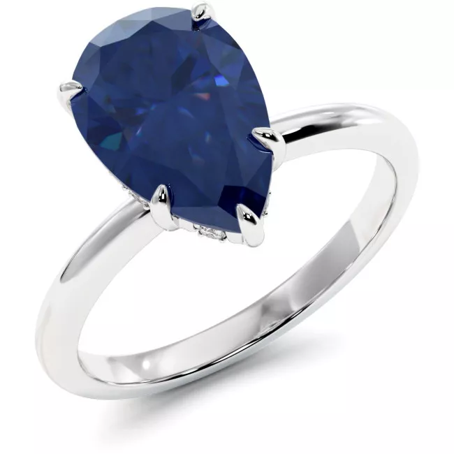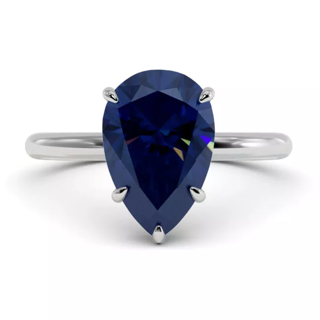 This stunning engagement ring is decorated with a 4.3 carat pear-shaped lab grown sapphire (blue or pink) in the center and round colorless moissanites with a total weight of 0.12 carats on the sides, in your choice of white,yellow or rose14k/18k gold.