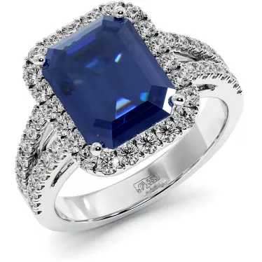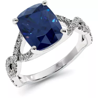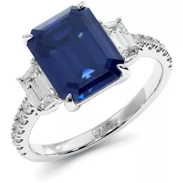 This stylish engagement ring features blue or pink lab grown sapphire 1.2 carat lab grown emerald cut or 1.2 carat radiant cut in white, yellow or rose 14k or 18k gold.