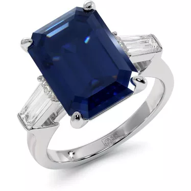 This spectacular engagement ring is decorated with a blue or pink lab grown sapphire cut "elongated kushon" weighing 11.4 carats in a halo of round black or white moissanites and ( total of 0.6 carats), the ring is available in white, yellow or rose gold 14k or 18k.