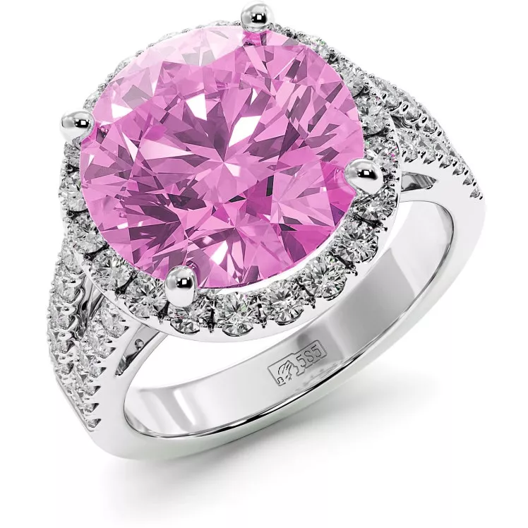 This beautiful ring features 5.76 carat center round lab grown sapphire blue or rose surrounded by halos of sparkling round moissanite (0.66 ct) side stones set in 14k or 18k white, yellow or rose gold.