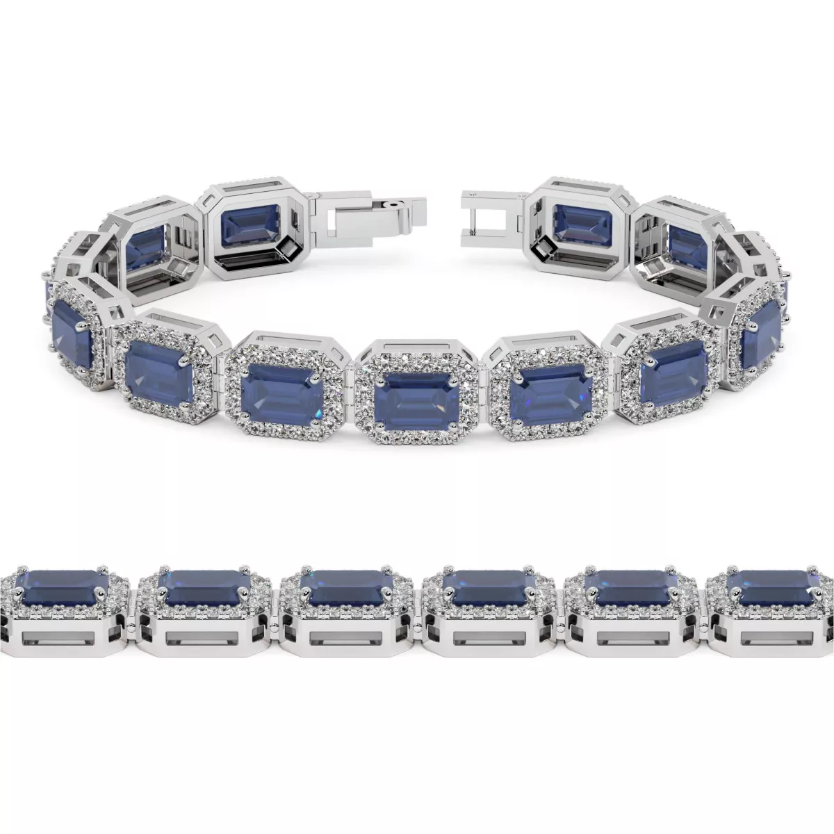 Восхитительный браслет с синими или розовыми сапфирами изумрудной огранки по 0,7 карата каждый в обрамлении мелких муассанитов, суммарно на 2,6 карата, из белого, желтого или розового золота 585 или 750 пробы.