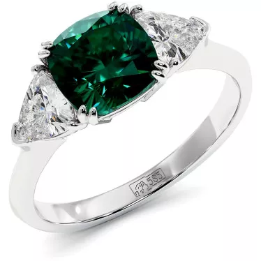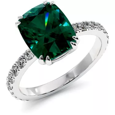 Это поразительное помолвочное кольцо с изумрудом огранки кушон весом 3,3 карата и боковыми муассанитами по шинке (0,48 карат) из белого, желтого или розового золота 585 или 750 пробы.