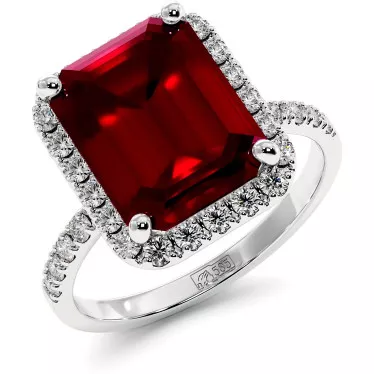 Это сногсшибательное кольцо украшено крупным рубином огранки овал на 8,6 карата в обрамлении 238 сверкающих круглых муассанитов суммарным весом 1,2 карата в оправе из золота 585 или 750 пробы