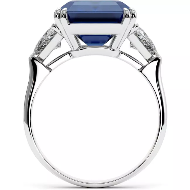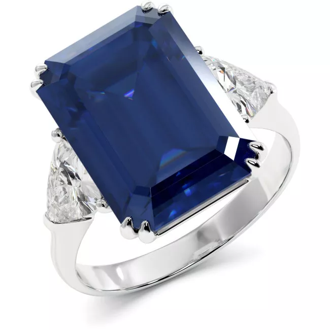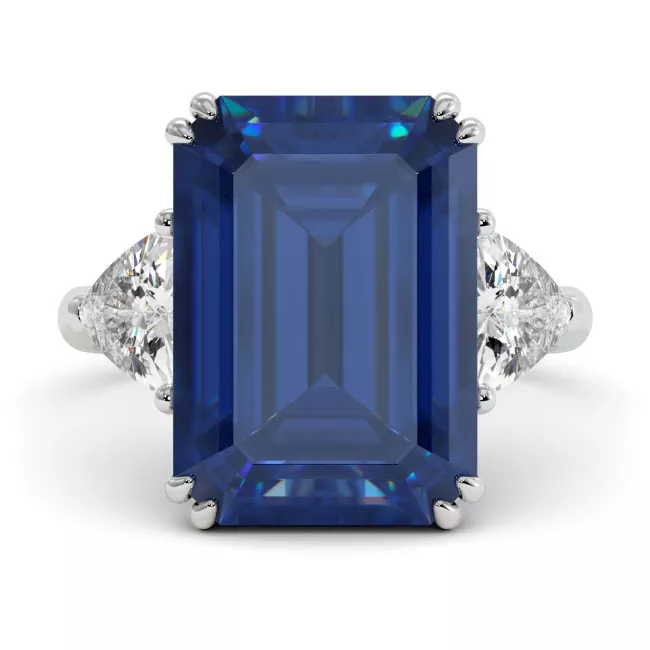 Восхитительное помолвочное кольцо с центральным синим или розовым сапфиром 10,2 карата изумрудной огранки, дополнено двумя треугольными муассанитами (суммарно 1,5 карата) из белого, желтого или розового золота 585 или 750 пробы.