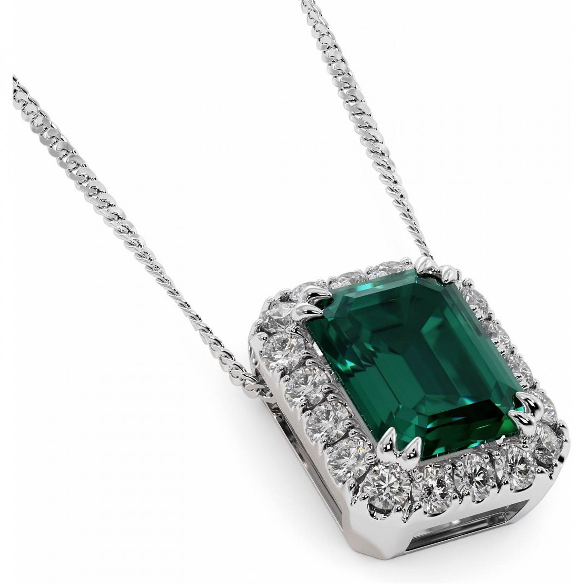 Этот стильный кулон с центральным изумрудом 2,5 карата изумрудной огранки или радиант и ореолом из 18 круглых муассанитов 1,5мм на 0,27 карата выполнен в золоте 585 или 750 на Ваш выбор.