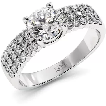 Восхитительное помолвочное кольцо с центральным муассанитом 0,9 карата огранки принцесса и двумя муассанитами принцесса (на 0,74 карата) из белого, желтого или розового золота 585 или 750 пробы.