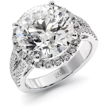 Эта помоловочное кольцо оригинального дизайна с круглым муассанитом весом 0,6 карата с пояском мелких камней и разделенной шинкой из белого, желтого или розового золота 585 или 750 пробы.