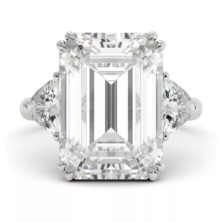Восхитительное помолвочное кольцо с центральным муассанитом 8,5 карата изумрудной огранки или 9,3 карата огранки радиант, дополнено двумя треугольными муассанитами (суммарно 1,5 карата) из белого, желтого или розового золота 585 или 750 пробы.