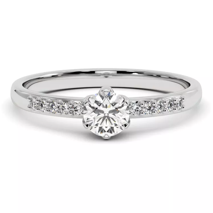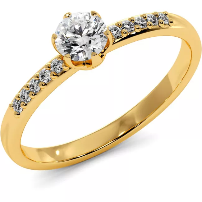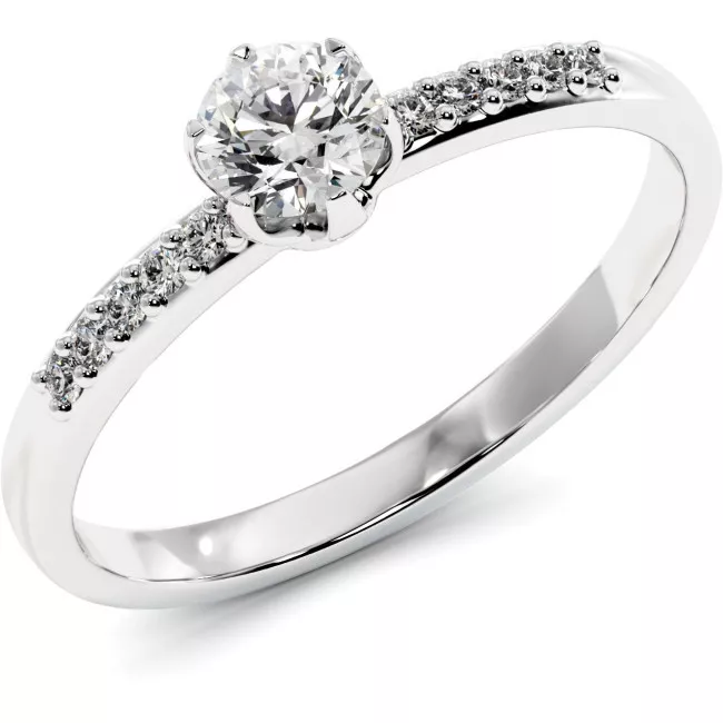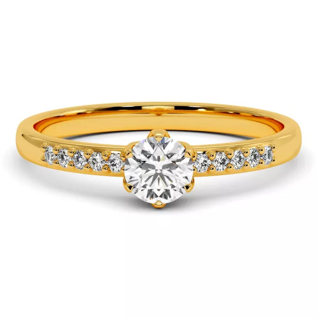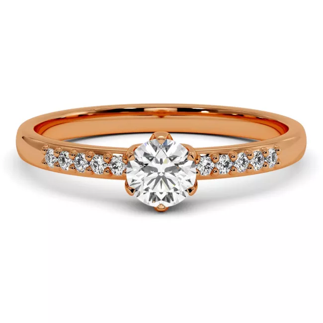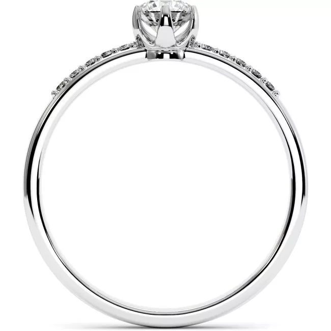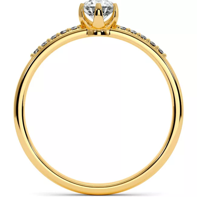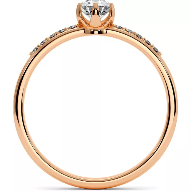 Элегантное помолвочное кольцо с центральным муассанитом 0,25 карат и дорожкой мелких муассанитов суммарно 0,05 карат, выполнено из белого, желтого или розового золота 585 или 750 пробы.