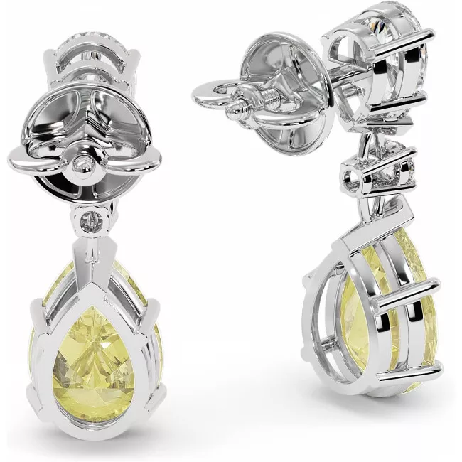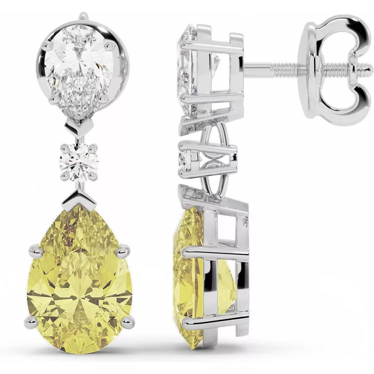 Восхитительные серьги с крупными желтыми муассанитами огранки груша по 3, 6 карата каждый в сочетании с белыми муассанитами (суммарно 2,2 карата) из белого, желтого или розового золота 585 или 750 пробы.